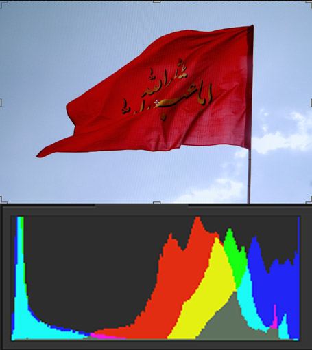 اگر دقت کنید متوجه میشوید که در هیستوگرام تصویر پرچم امام حسین علیه السلام ، تنها کانال آبی از مرز سمت راست هیستوگرام عبور کرده . یعنی رنگ آبی روشن ترین رنگ تصویر است و به عبارت دیگر اگر به نواحی روشن تصویر نگاه کنیم ، تم رنگی آبی را مشاهده خواهیم کرد . در عکس هم دقیقا همین طور است . روشن ترین بخش عکس آسمان آبی ست که رنگ آن آبی روشن است . اگر دقت کنید متوجه میشوید که جزییات خاصی از آسمان ثبت نشده و ابر های پشت پرچم خیلی صاف و سفید یک دست به نظر میرسند و عمقی ندارند .